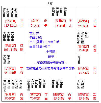 A君的財帛宮見著了太陽星化忌,使得夫妻宮裡的天梁星從蔭星變成「刑」星,所以子女宮裡的天相星變成為「刑忌夾印」的格局,除了不利子息之外,這個天相復受擎羊的侵擾,那也就是說「性愛對象難以進入這個子女宮位」,所以他很難擁有親密的伴侶;而A君的子女宮位是為廉貞星化祿,破軍星化權,可說是熱鬧異常,那與A君的交友情況有如天壤之別。