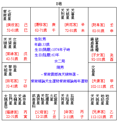 各位從A、B君的命運剖析,可以發覺大不相同的命勢走勢,而他們倆位的個性脾氣也是大異其趣,命盤的生命故事,當是篤實而不是霧裡看花般無厘頭的「霧煞煞」,如果您想瞭解更多更深入的斗數知識,請加入我們即將開課的紫微斗數初級班吧!。